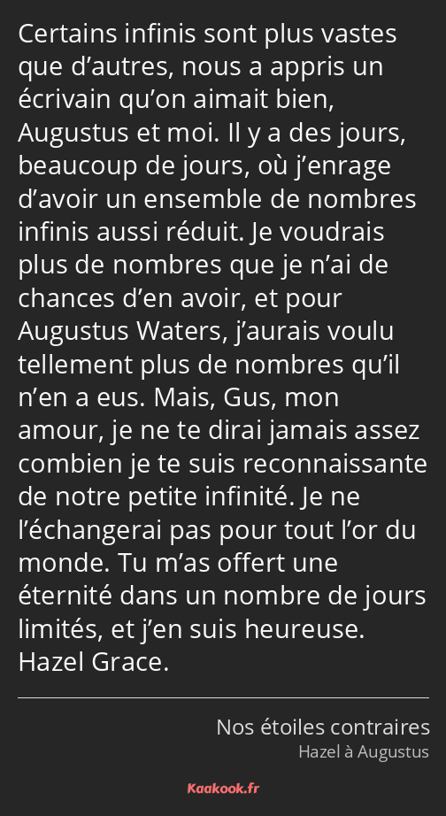 Citation augustus nos etoiles contraires. L amour entre deux êtres l amour de parents envers leur enfant l amour entre deux amis. Chaque citation exprime les opinions de son auteur et ne saurait engager. Et l amour de ces deux étoiles pour la vie. Il y a si longtemps maintenant que j attends mon cancer je ne vais quand même pas partir sans.