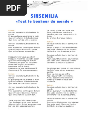 Texte chanson tout le bonheur du monde. On vous souhaite tout le bonheur du monde et que quelqu un vous tende la main que votre chemin évite les bombes qu il mène vers de calmes jardins on vous souhaite tout le bonheur du monde pour aujourd hui comme pour demain que votre soleil éclaircisse l ombre qu il brille d amour au. Paroles de la chanson tout le bonheur du monde par sinsemilia paroles de michel d inca laurent gisclard musique de issa kourouma michel d inca laurent gisclard eric monod fabien daian jean christophe della gloria luc di feliciantonio bouabdellah grib christophe baffert olivier inebria ivan olivier carine serre. Oh oui tout le bonheur du mondetout le bonheur du monde cette chanson est une reprise. Paroles de tout le bonheur du monde refrain.